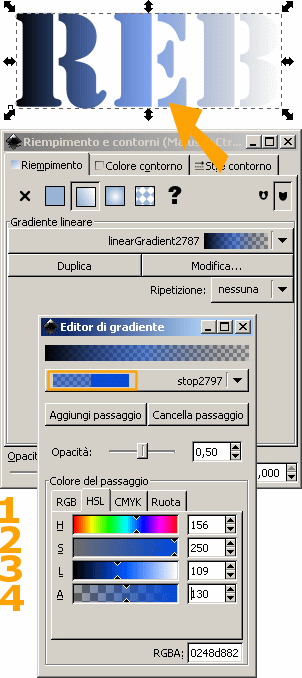 Scelgo l'opzione Riempimento sfumato lineare; per aggiungere colori, premo Modifica e compare il pannello Editor di gardiente (in basso); con Aggiungi passaggio duplico la zona-colore attiva che provvederò a modificare: